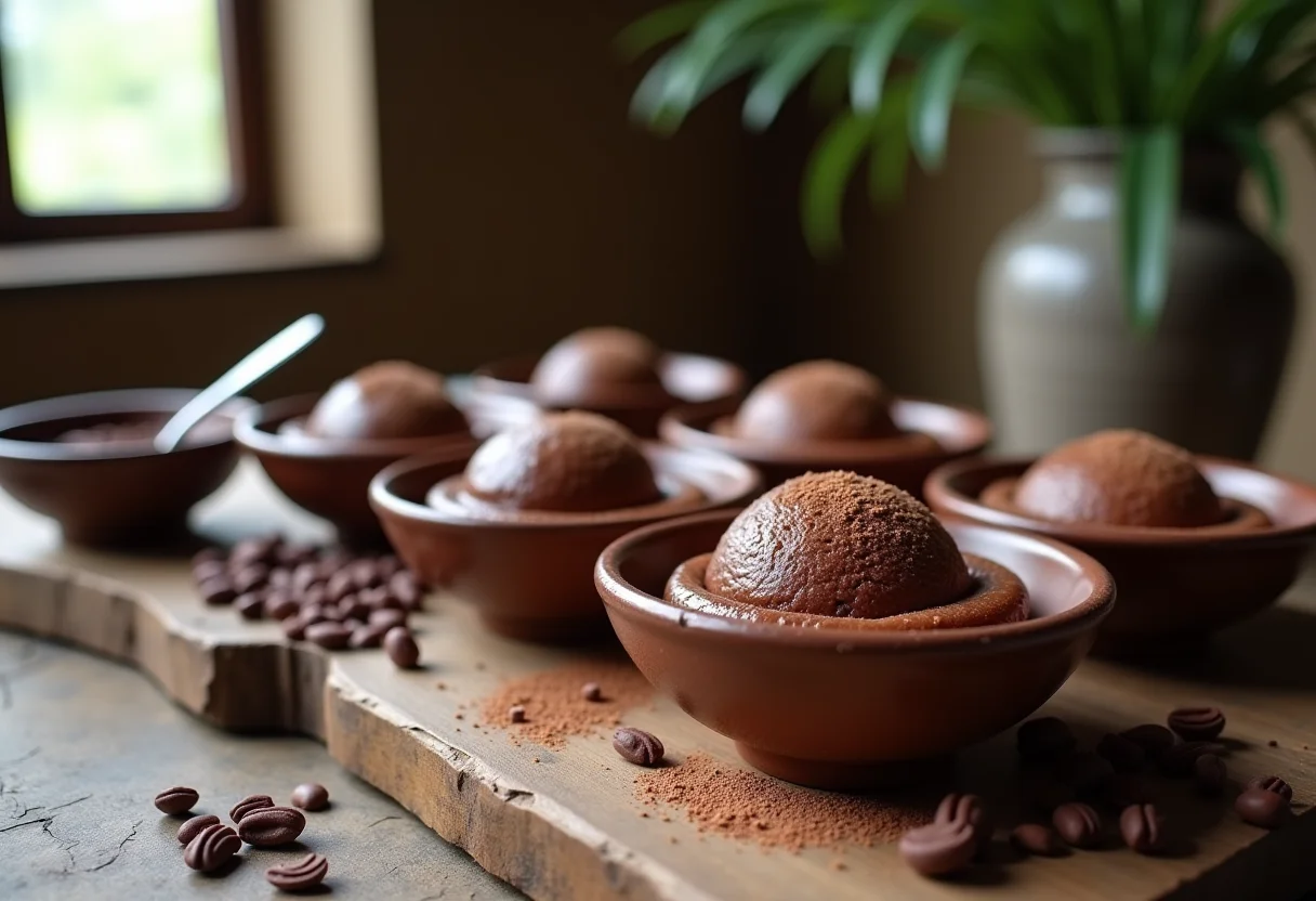 Doce de leite com chocolate sendo oferecido em uma tigela rústica.